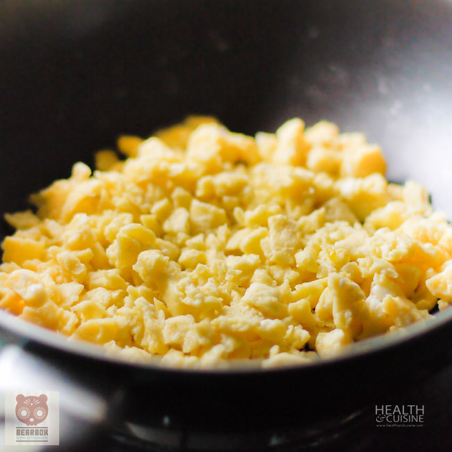 4. ตีไข่ให้เข้ากัน ปรุงรสด้วยเกลือและนํ้าตาล (2) ใส่ลงในกระทะ ฉีดสเปรย์นํ้ามันบางๆ ไฟอ่อนคนเป็นระยะให้ไข่สุก ปิดเตา ให้ตะหลิวตัดให้ไข่เป็นชิ้นเล็กๆ