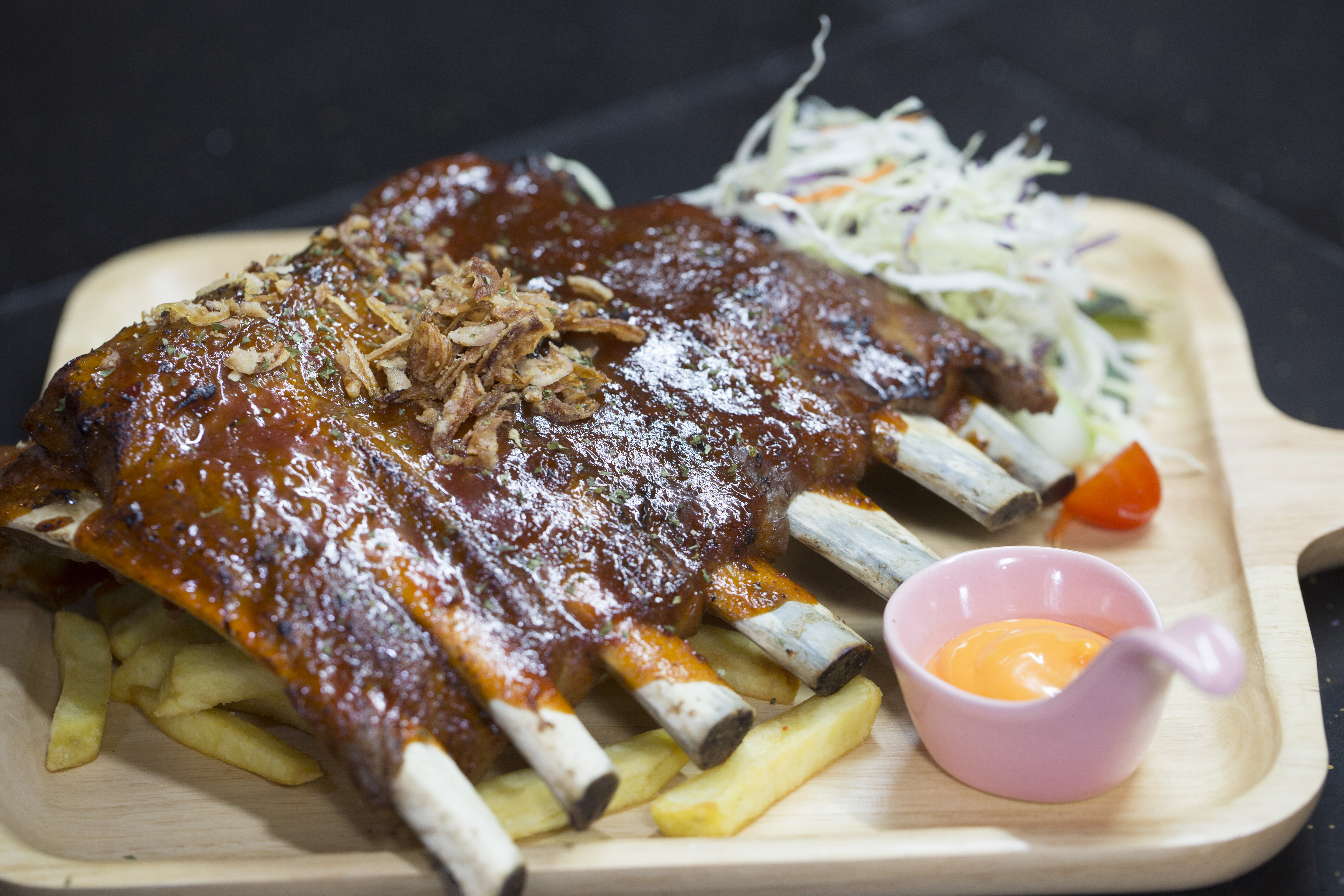 ย่างซี่โครง(ทำสุกมาก่อนแล้ว) ให้มีกลิ่นไหม้เกรียม ๆ ทาซอสบาร์บีคิวให้ทั่วแล้วนำไปอบ
