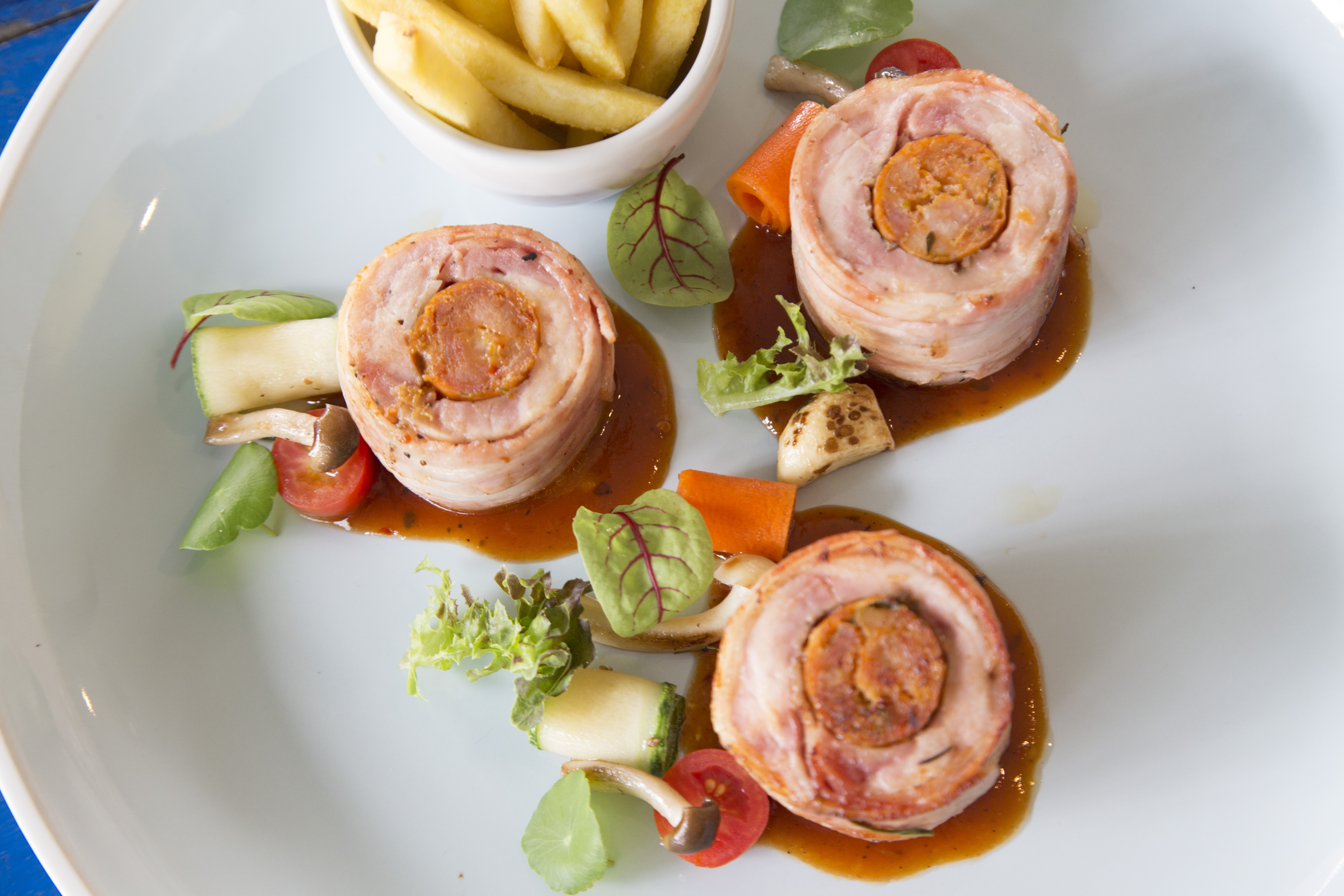 “ไก่ที่เอาไว้แรปเป็นน่องติดสะโพก เลือกใช้ส่วนนี้เพราะว่า ถ้าใช้ส่วนอื่น มันจะแข็ง สมมุติใช้อก ได้ปริมาณเยอะจริงแต่มันแข็ง มันจะแห้ง แต่สะโพกมันจะมีความชุ่ม มันมีกล้ามเนื้อ มีความนุ่ม มีมันแทรกอยู่ ตรงกลางจะเป็นไส้อั่วที่เป็นสูตรของผมแล้วมีเบคอนพันอยู่ข้างนอก”