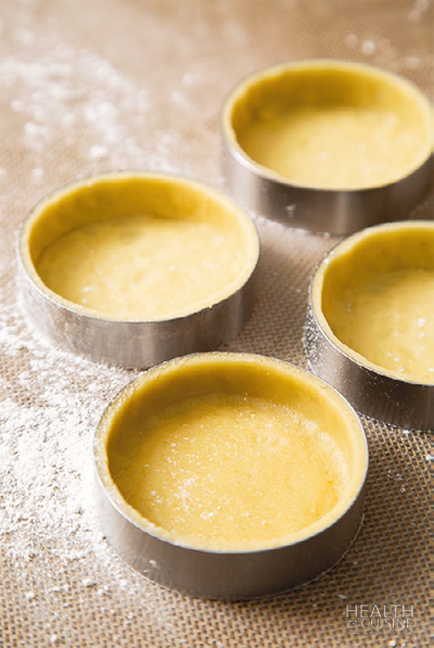 4. นำไข่ขาวที่แยกไว้ไปตีกับน้ำตาลทรายที่เหลือ (50 กรัม)ให้ขึ้นฟูพอตั้งยอดอ่อน นำไปผสมกับส่วนผสมที่เตรียมไว้ในข้อ 3 คนผสมเบา ๆ ให้ส่วนผสมเข้ากันดี เทใส่ถาดอบขนาด12 × 16 นิ้วที่ทาเนยปูกระดาษไขไว้แล้ว นำไปอบที่อุณหภูมิ 180 องศาเซลเซียส ประมาณ 10 – 14 นาทีจนกระทั่งสุก นำออกมาพักให้เย็น ใช้พิมพ์วงกลม (ขนาดเล็กกว่าเปลือกทาร์ต) ตัดเค้กออกมาเป็นชิ้น เตรียมไว้