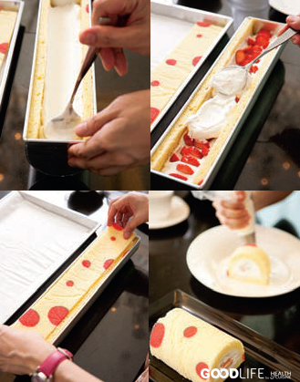 10. หลังจากวางตัวแป้งบนส่วนโค้งของพิมพ์แล้วตีวิปปิ้งครีมกับน้ำตาลทราย (3) ให้ขึ้นฟูตักใส่ลงบนแป้งประมาณ 1-3 ของความสูงหั่นสตรอว์เบอร์รี่เป็นแว่น ๆ ใส่ลงในวิปปิ้งครีมแล้วจึงตักวิปปิ้งครีมที่เหลือใส่ลงไปให้เต็มปิดฐานด้วยแป้งอีกชิ้นที่เตรียมไว้ หุ้มด้วยฟิล์มถนอมอาหารแช่เย็นไว้ประมาณ 2 ชั่วโมง