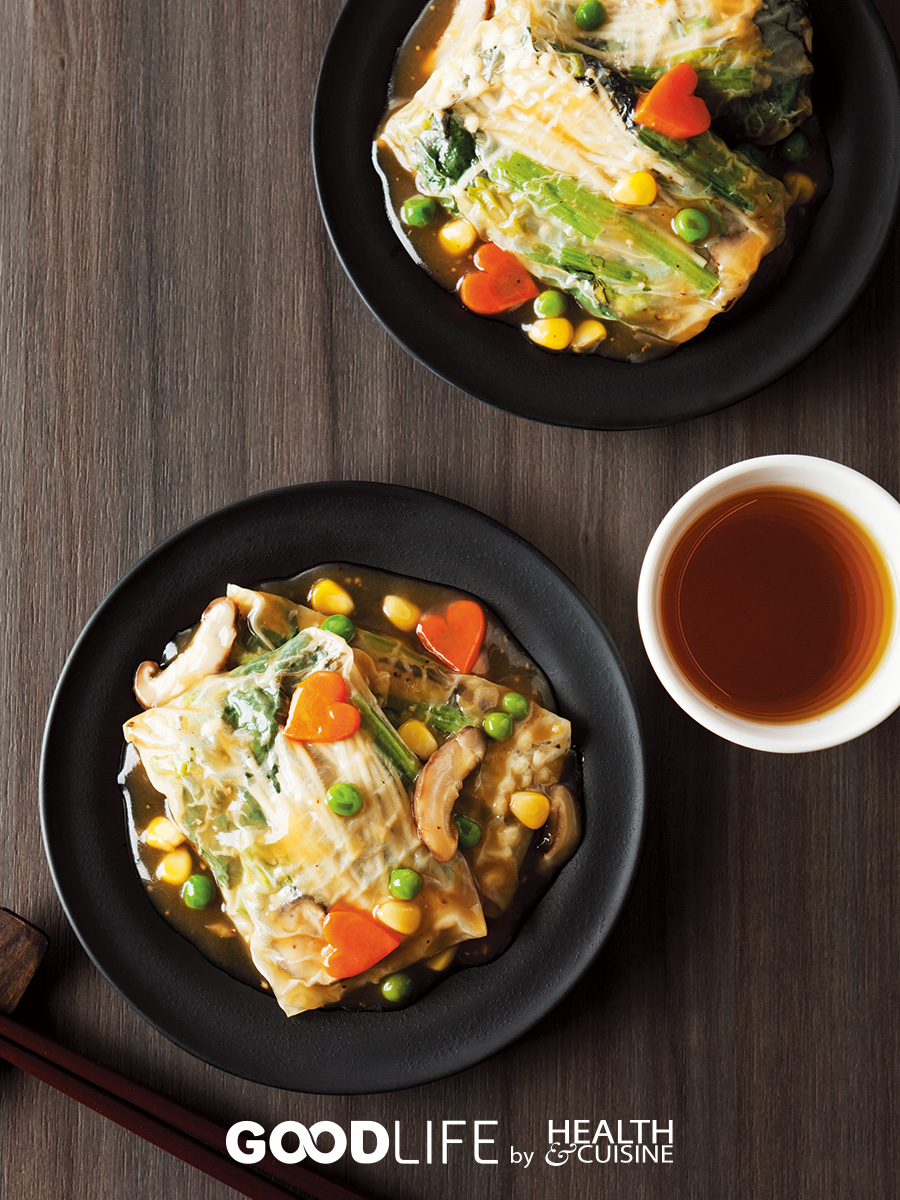 - แผ่แผ่นฟองเต้าหู้ออก วางเห็ดเข็มทองทับลงไป ตามด้วยผักที่คลุกรวมกันไว้ในข้อ 1 พับฟองเต้าหู้ห่อให้แน่นวางเรียงใส่จานจนครบ แล้วนำไปนึ่งบนลังถึง 10 นาที