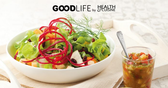 สลัด หน้าตาดีจานนี้จัดอะโวคาโดชิ้นโตไว้กลางจาน เรียงผักสลัดกรีนโอ๊ก แครอต และบีตรู้ตอยู่รายรอบ ก่อนราดด้วยน้ำสลัดรสเปรี้ยวหวานทำจากผักผลไม้สดหลากชนิดหั่นเต๋าเคล้ารวมกับน้ำแอ๊ปเปิ้ลคั้นสด แล้วปรุงรสด้วยเครื่องเทศหอมๆ อย่างโรสแมรี่และอิตาเลียนซีซันนิ่ง (Italian Seasoning) รับรองว่ารสชาติดี รับประทานแล้วไม่อ้วน แถมคุณค่าสารอาหารเพียบ!