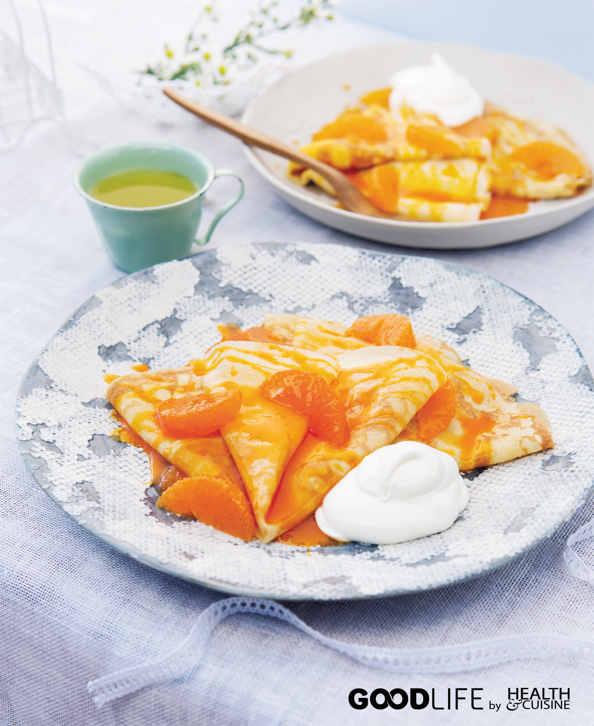 2. ตักเนื้อส้มแยกไว้ จัดเครปที่ทอดแล้วใส่ลงจาน ราดด้วยซอสส้มพอชุ่ม เสิร์ฟคู่กับเนื้อส้มและวิปปิ้งครีม
