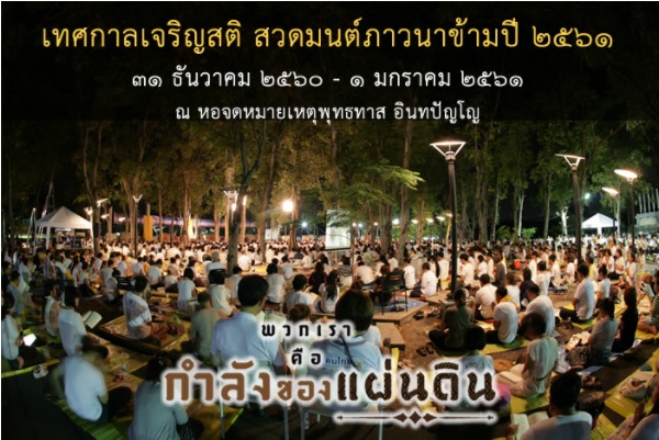 ขอเชิญร่วมปฏิบัติภาวนา สวดมนต์ข้ามปี 2561 ส่งท้ายปี เพื่อปีใหม่…ชีวิตใหม่ เพื่อชำระล้างจิตใจให้ผ่องใส ให้มีสติและปัญญาในการดำรงชีวิตและปฏิบัติหน้าที่อย่างถูกต้อง เพื่อร่วมแรงกันเป็นกำลังของแผ่นดิน ในวันที่ 31 ธันวาคม 2560 ถึง 1 มกราคม 2561