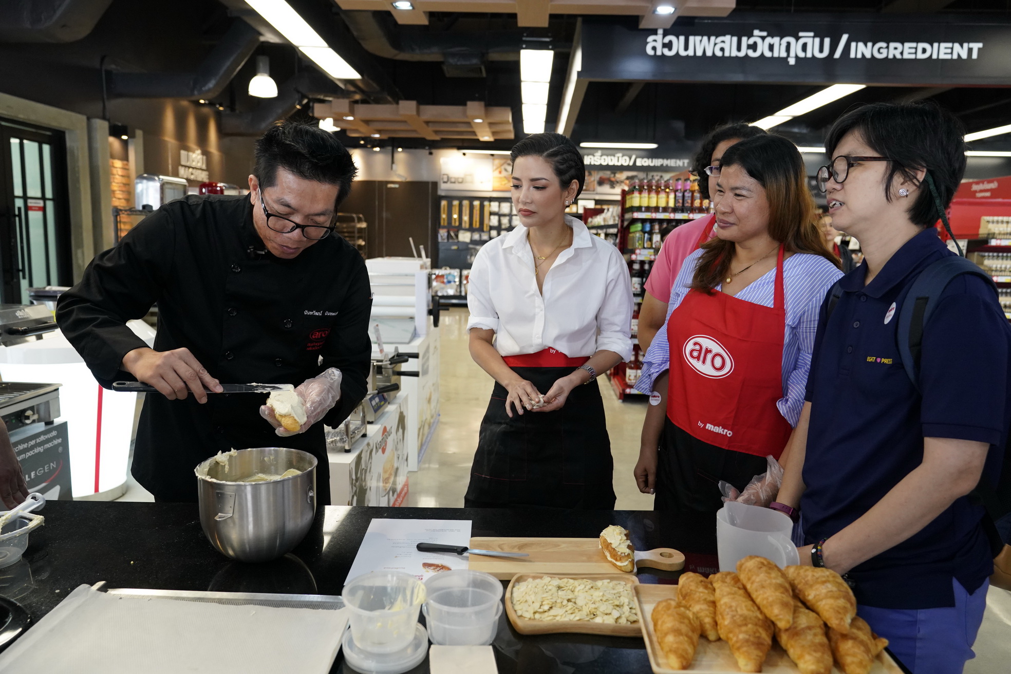 นอกจากเยี่ยมชมการผลิตเบเกอรี่ของแม็คโครแล้ว คุณแม่สายสุขภาพ อ้อม พิยดา ก็มาร่วมเวิร์คช็อปกับสื่อมวลชนด้วย ในการทำเบเกอรี่ปลอดไขมันทรานส์ ด้วยเมนู อัลมอนด์ครัวซองค์ โดยมีเชฟแดง คุณนันทวัฒน์ นันทะเนตร ผู้เชี่ยวชาญด้านเบเกอรี่จากแม็คโคร เป็นผู้สอนอีกด้วยค่ะ บอกเลยว่าบรรยากาศสนุกสนาน และเป็นกันเองมากๆค่ะ