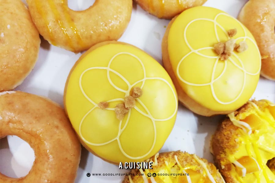 “ แมงโก้ ครีม เค้ก” โดนัทเคลือบครีมมะม่วงเนียนนุ่ม พร้อมบิสกิตครัมบ์กรุบกรอบและเนื้อมะม่วง ตกแต่งลวดลายด้วยคัสตาร์ดแสนหวาน