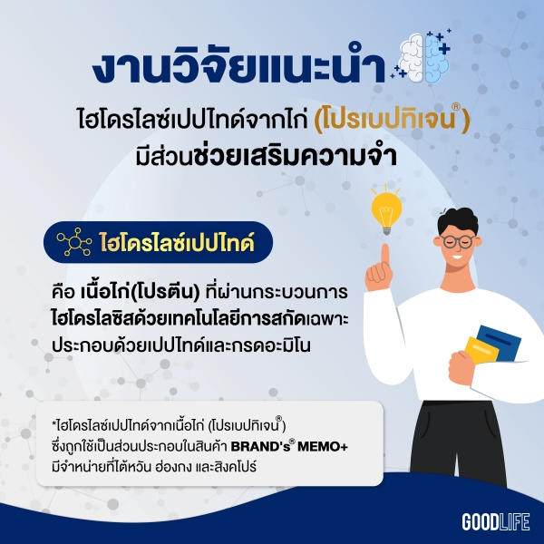 หนึ่งในแนวทางที่ได้รับการสนับสนุนจากงานวิจัย “Hydrolyzed Chicken Extract (ProBeptigen®) on Cognitive Function in Healthy Middle-Aged People: A Randomized Double-Blind Trial”คือไฮโดรไลซ์เปปไทด์จากไก่ (โปรเบปทิเจน®)* สารอาหารที่พัฒนาต่อยอดจากซุปไก่สกัด มีส่วนช่วยให้ความจำดีขึ้น