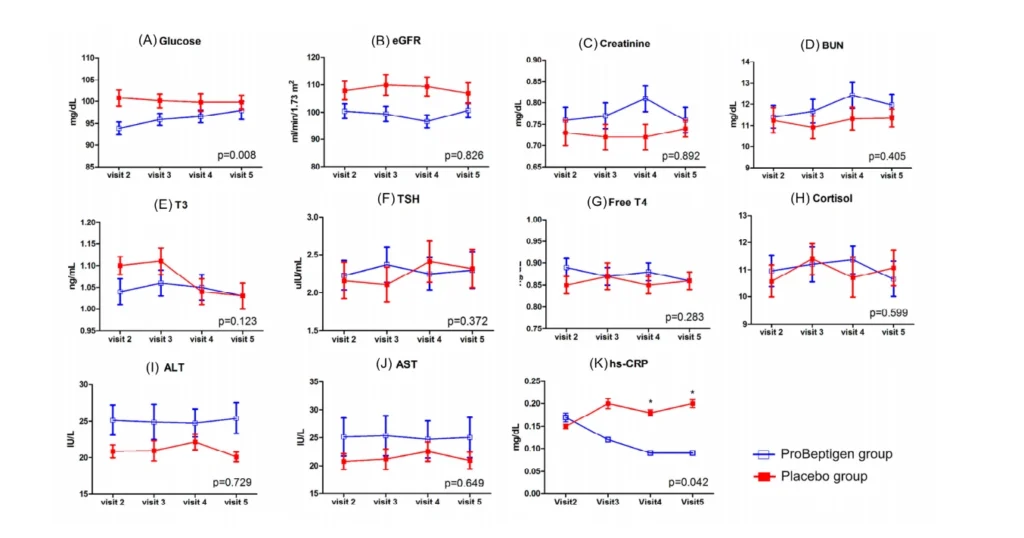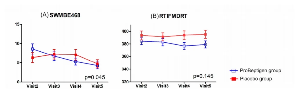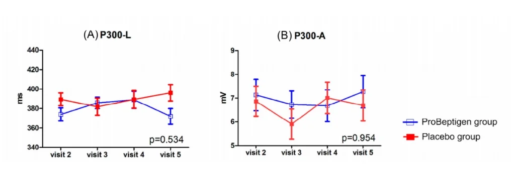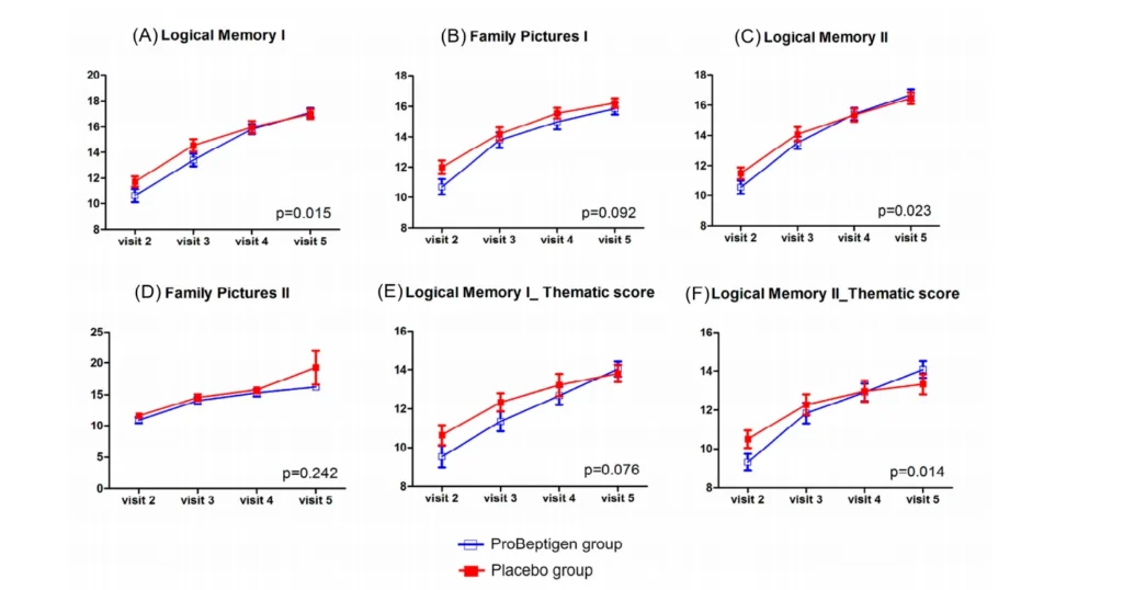 670 มิลลิกรัมนาน 2 เดือนมีความจำทางภาษาทั้งระยะสั้นและระยะยาว (ภาพประกอบ 1) และความจำใช้งาน (ภาพประกอบ 2) ดีขึ้นเมื่อเทียบกับกลุ่มควบคุมที่ได้รับยาหลอก (placebo) การรับประทานไฮโดรไลซ์เปปไทด์ สารสกัดจากไก่ (โปรเบปทิเจน®)* ลดตัวบ่งชี้การอักเสบ (hs-CRP) ได้อย่างมีนัยสำคัญโดยเห็นผลมากขึ้นตามระยะเวลาเมื่อเทียบกับกลุ่มควบคุม (ภาพประกอบ 3) และไฮโดรไลซ์เปปไทด์ สารสกัดจากไก่ (โปรเบปทิเจน®)* ไม่ส่งผลกระทบต่อความรู้สึกเครียด อารมณ์(ภาวะซึมเศร้า, ความวิตกกังวล) และคุณภาพการนอนหลับ (ภาพประกอบ 4)