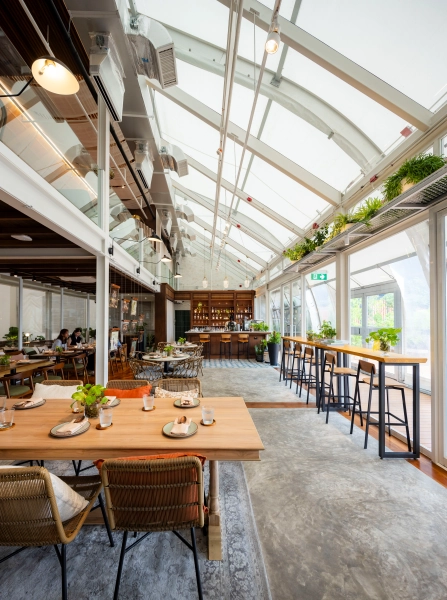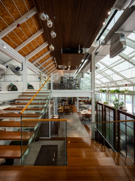 เมื่อก้าวเข้ามาภายในร้าน คุณจะสัมผัสได้ถึงบรรยากาศอบอุ่นจากวัสดุธรรมชาติที่ผสานความร่วมสมัยอย่างลงตัว การตกแต่งด้วยโทนไม้และสีเอิร็ธโทนช่วยสร้างความผ่อนคลายแต่ยังคงความหรูหรา พื้นที่ภายในถูกออกแบบไห้เป็นเสมือนโอเอชิสกลางเมือง รายล้อมด้วยต้นไม้เขียวสดชื่น มีทั้งที่นั่งชั้นล่าง ชั้นบน และโซนส่วนตัวสำหรับกลุ่มที่ต้องการความเป็นส่วนตัวมากขึ้น