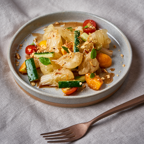 สลัดสัมโอสไตล์อินโด เมนูนี้สะท้อนเสน่ห์อาหารเอเชียตะวันออกเฉียงไต้ได้เป็นอย่างดี ด้วยการผสานรสเผ็ด หวาน มัน เค็ม และเปรี้ยวไว้อย่างลงตัวส้มโอเนื้อแน่นฉ่ำคลุกเคล้าเครื่องเคียงหลากชนิด ราดด้วยน้ำสลัดสูตรเฉพาะของทางร้านที่หวานๆ เปรี้ยวๆ รสชาติที่ได้คือความสดชื่นกลมกล่อมแบบทรอปีคัล เหมาะทั้งเป็นเมนูเรียกน้ำย่อยและมื้อสุขภาพเบาๆ
