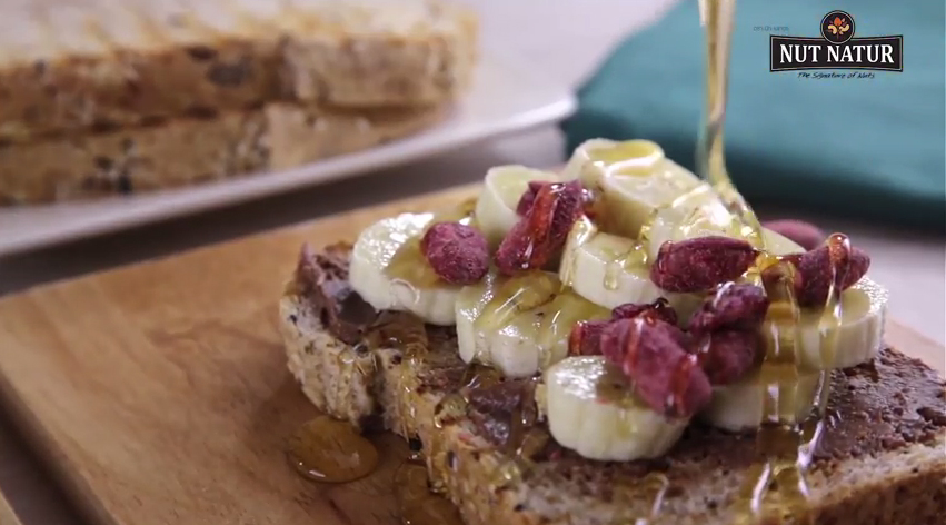 - โรยถั่วอัลมอนด์อบกรอบผสมแครนเบอร์รี่อบแห้งตรา NUT NATUR